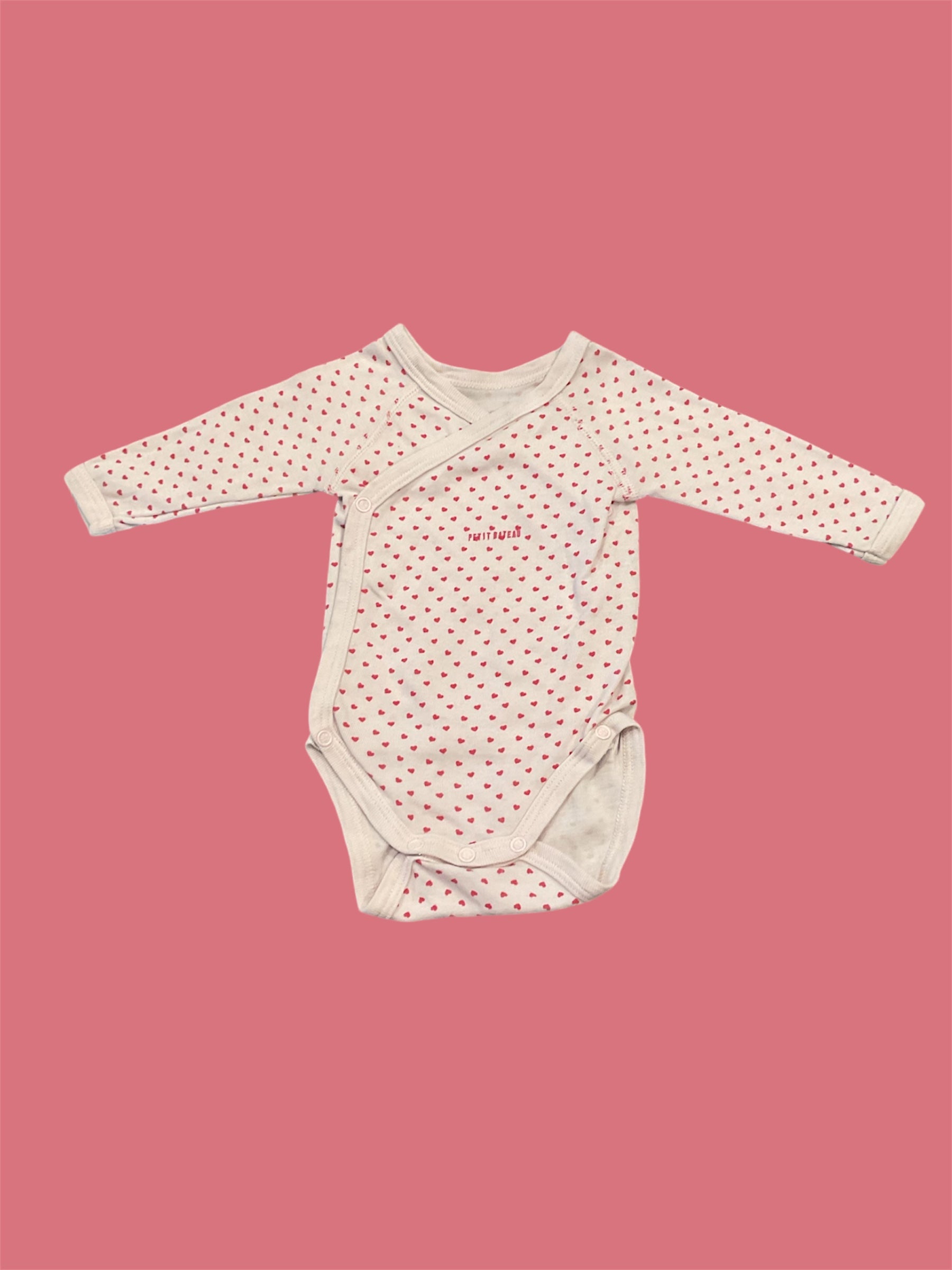 Body croisé manches longues en taille 1 mois de la marque Petit Bateau. Rose clair petits cœurs rouge. Ouverture par boutons pressions sur le devant et à l’enjambe