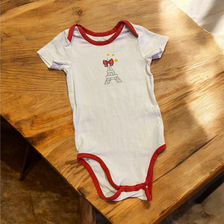 Body pour bébé, fille, blanc et rouge, motif tour Eiffel petit nœud et étoiles.