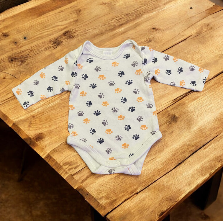 Body pour bébé, garçon, blanc motif pattes de chat, manches longues. 100% coton.