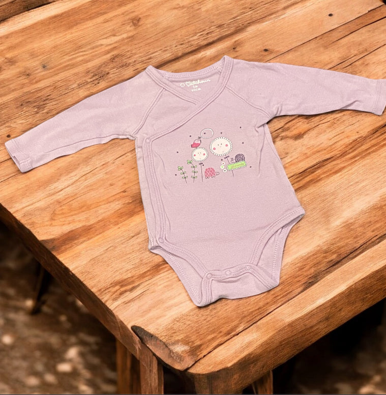 Body fille, lilas, imprimé fleurs et animaux du jardin.