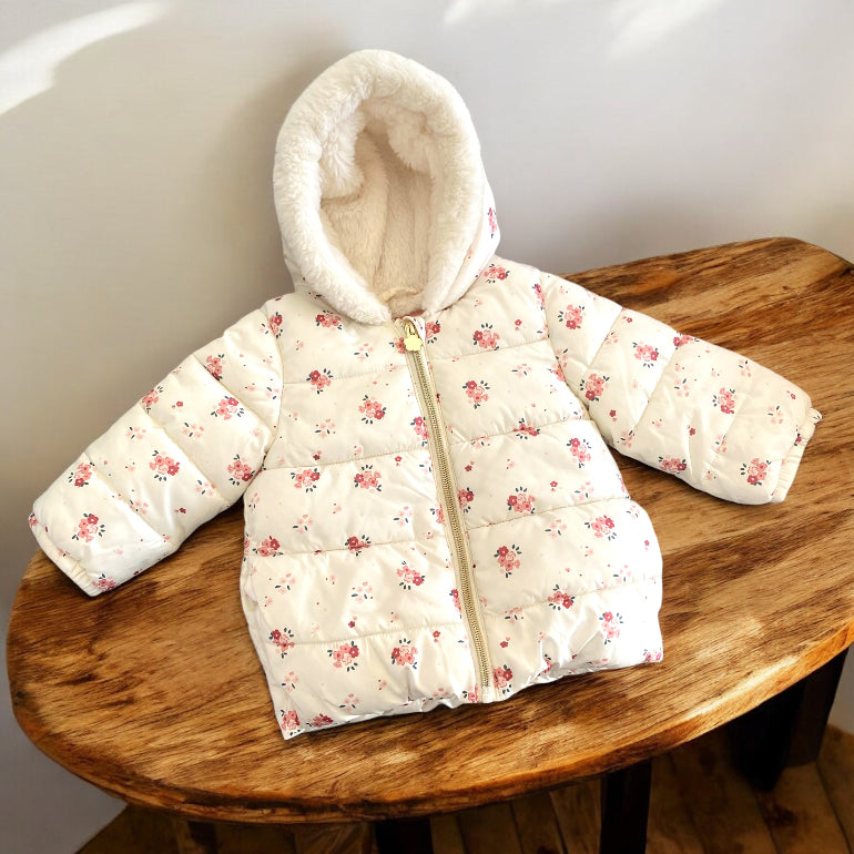 Doudoune chaude à capuche pour bébé, fille, doublée, intérieur tout doux, blanc motif fleurs rose.