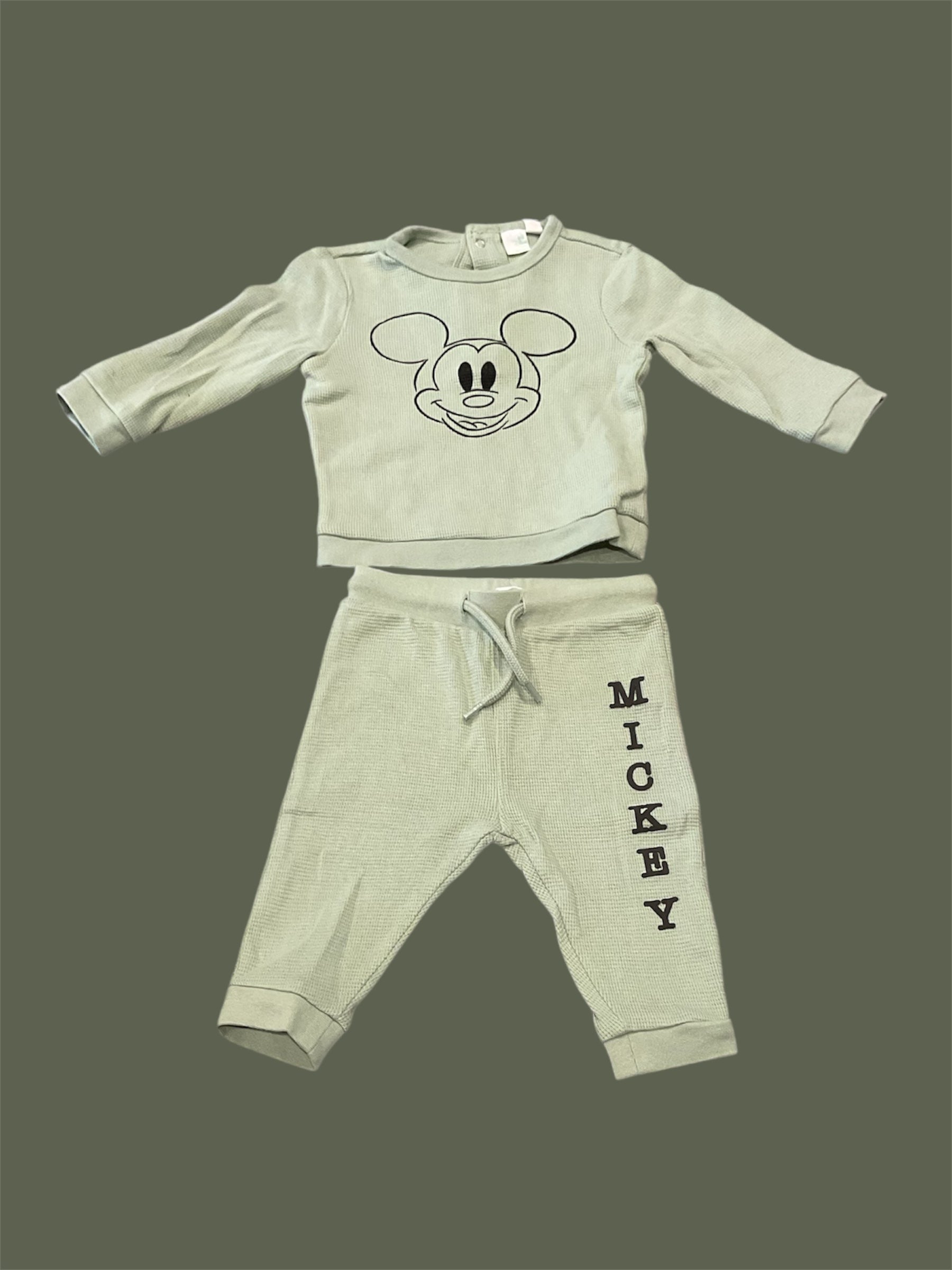 Ensemble en taille 6 mois. Pull vert clair en nid d’abeilles imprimé Mickey sur le devant, ouverture par boutons pressions au dos. Pantalon assorti cheville resserrées, taille élastique + cordons pour un ajustement parfait.