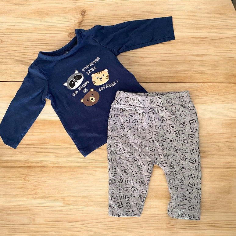 Pantalon gris, motifs animaux + Pull léger, bleu marine motifs animaux
