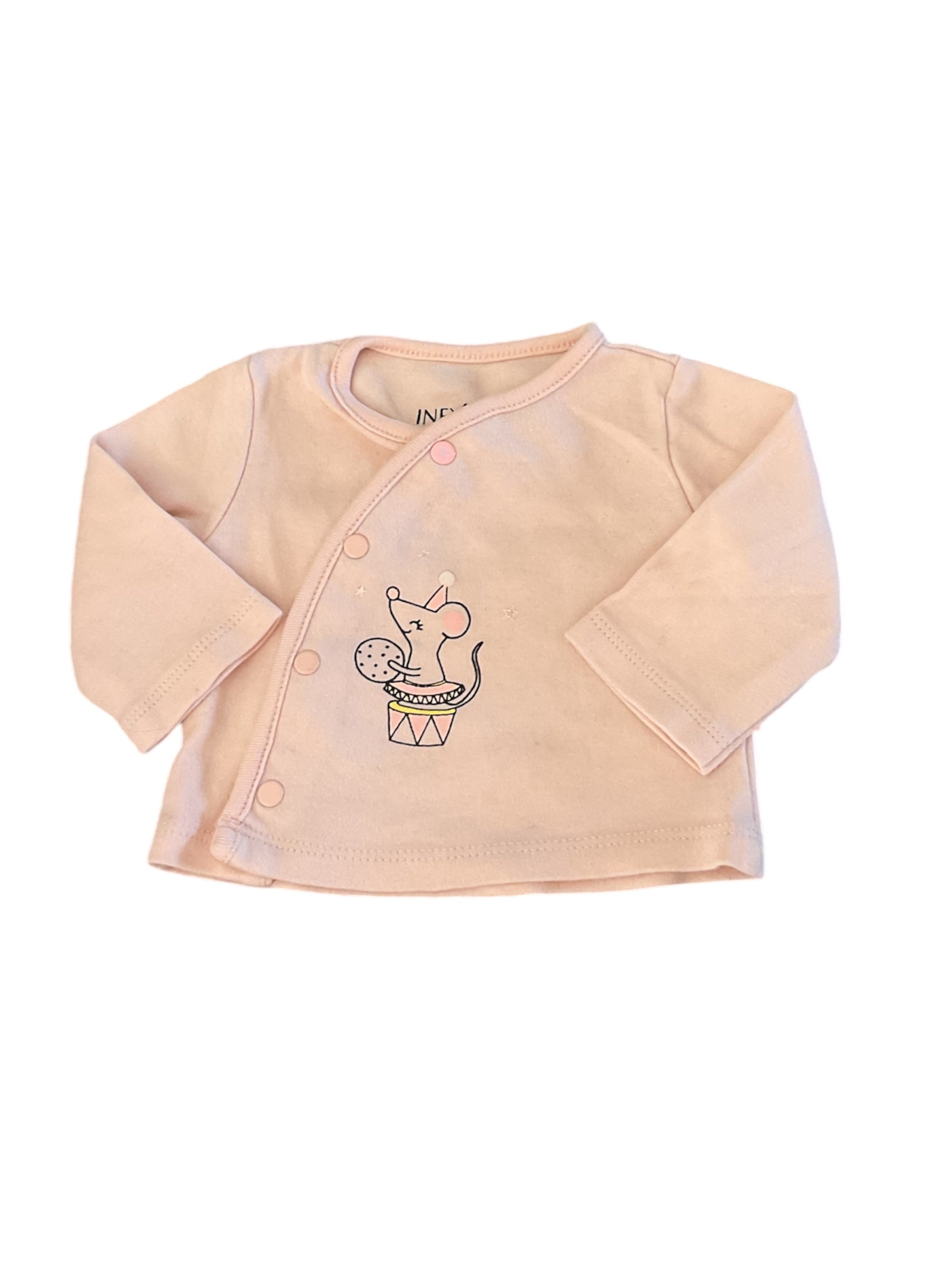 Haut brassière manches longues en taille 1 mois, rose. Ouverture par boutons pressions sur l’avant.