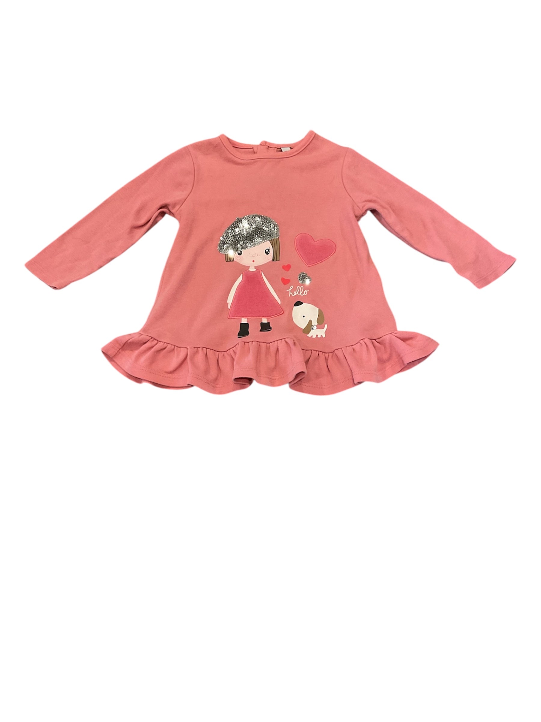 Haut manches longues long rose motif petite fille et son chien, bonnet pailleté. 12 mois.