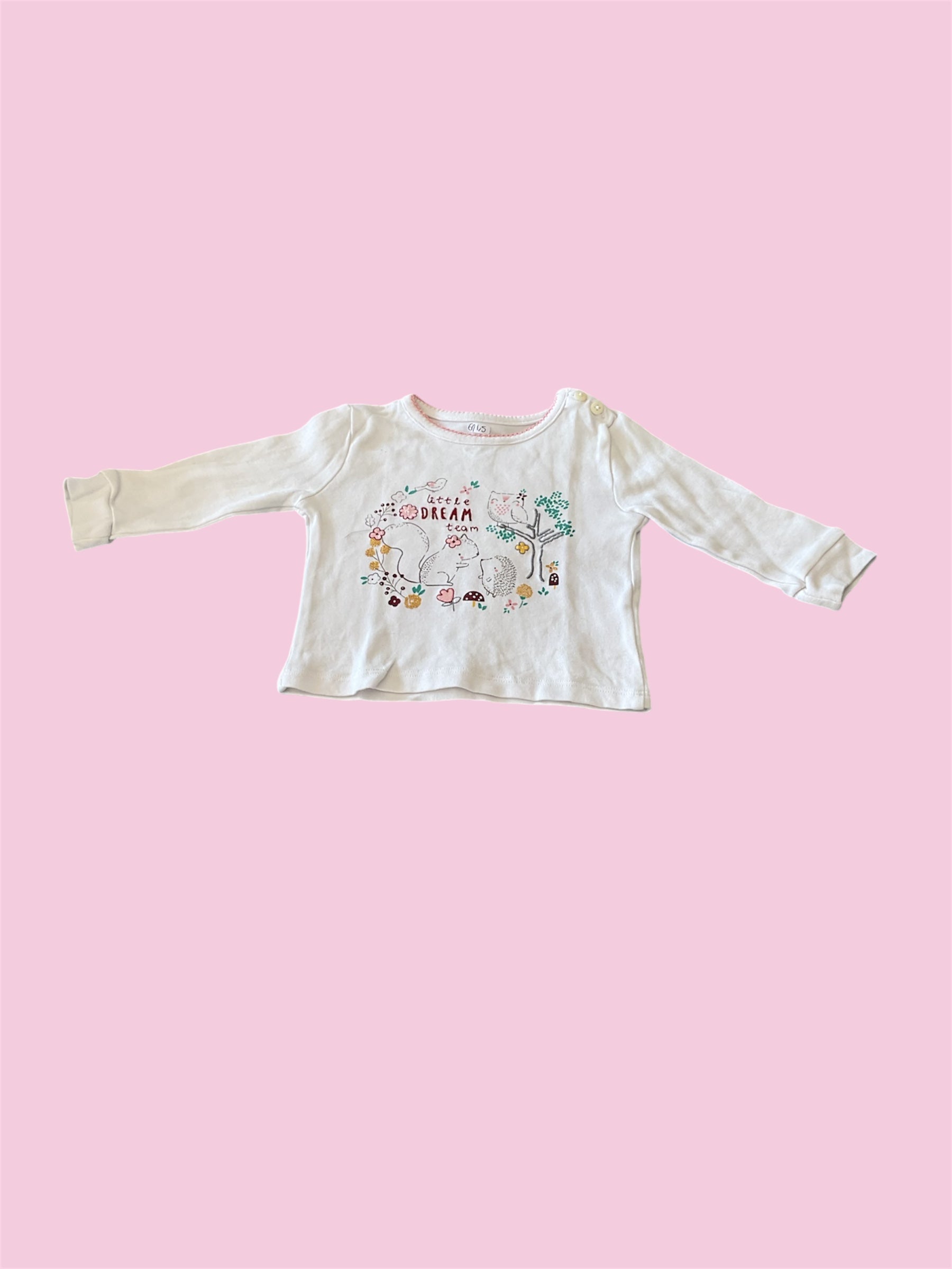 Pull manches longues blanc, motif animaux de la forêt. 6 mois.