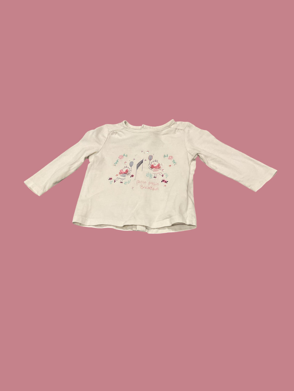 Haut manches longues, Sergent Major, blanc motif petites oursons jouant au badminton, petits noeuds cousus, en taille 6 mois.