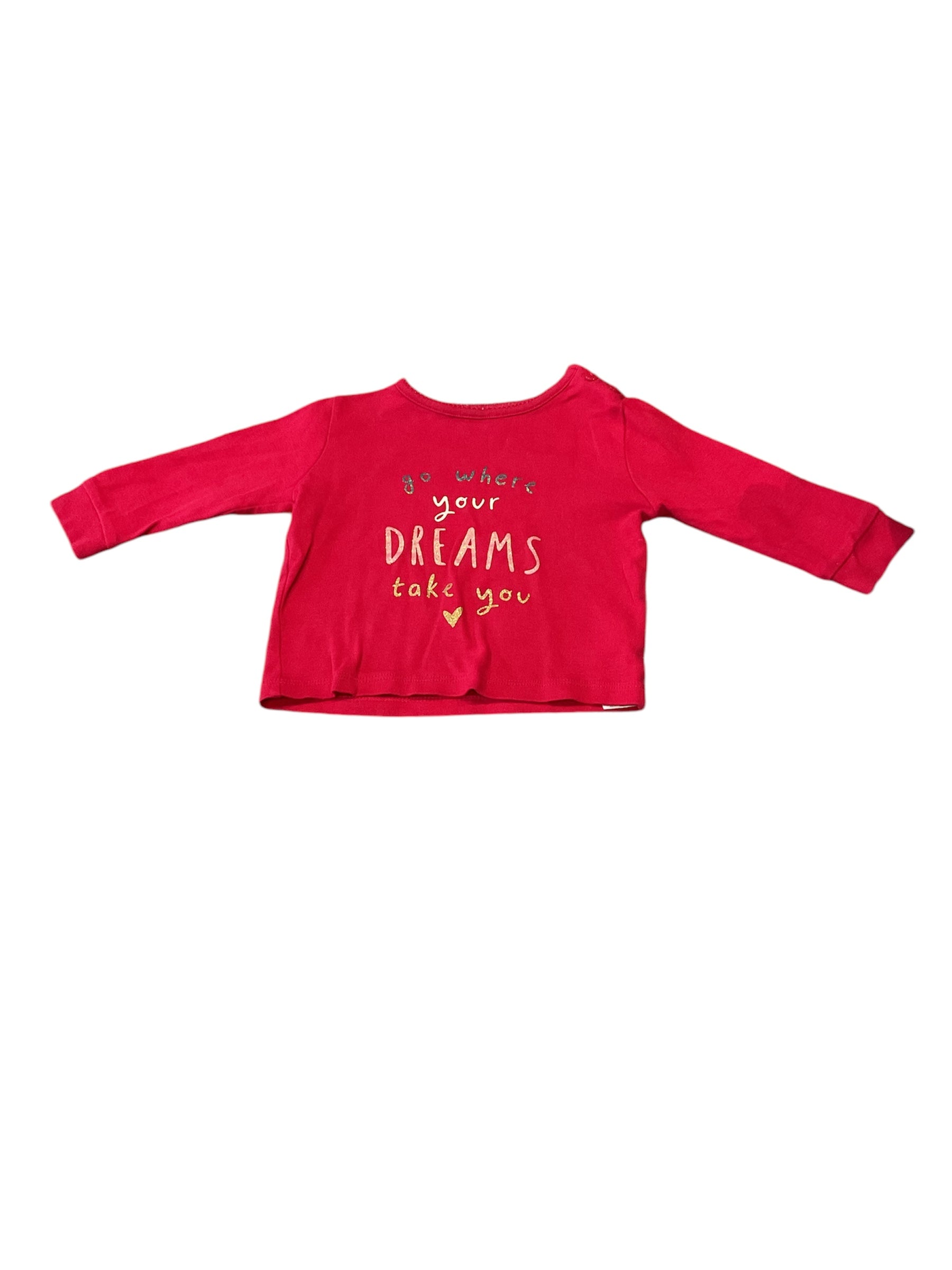 Haut rouge inscription pailletée, manches longues 9 mois.