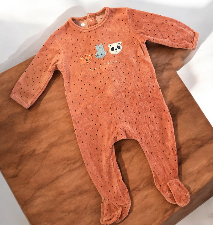 Pyjama dors-bien velours, bébé garçon, brun motif animaux de la forêt. 9 Mois.