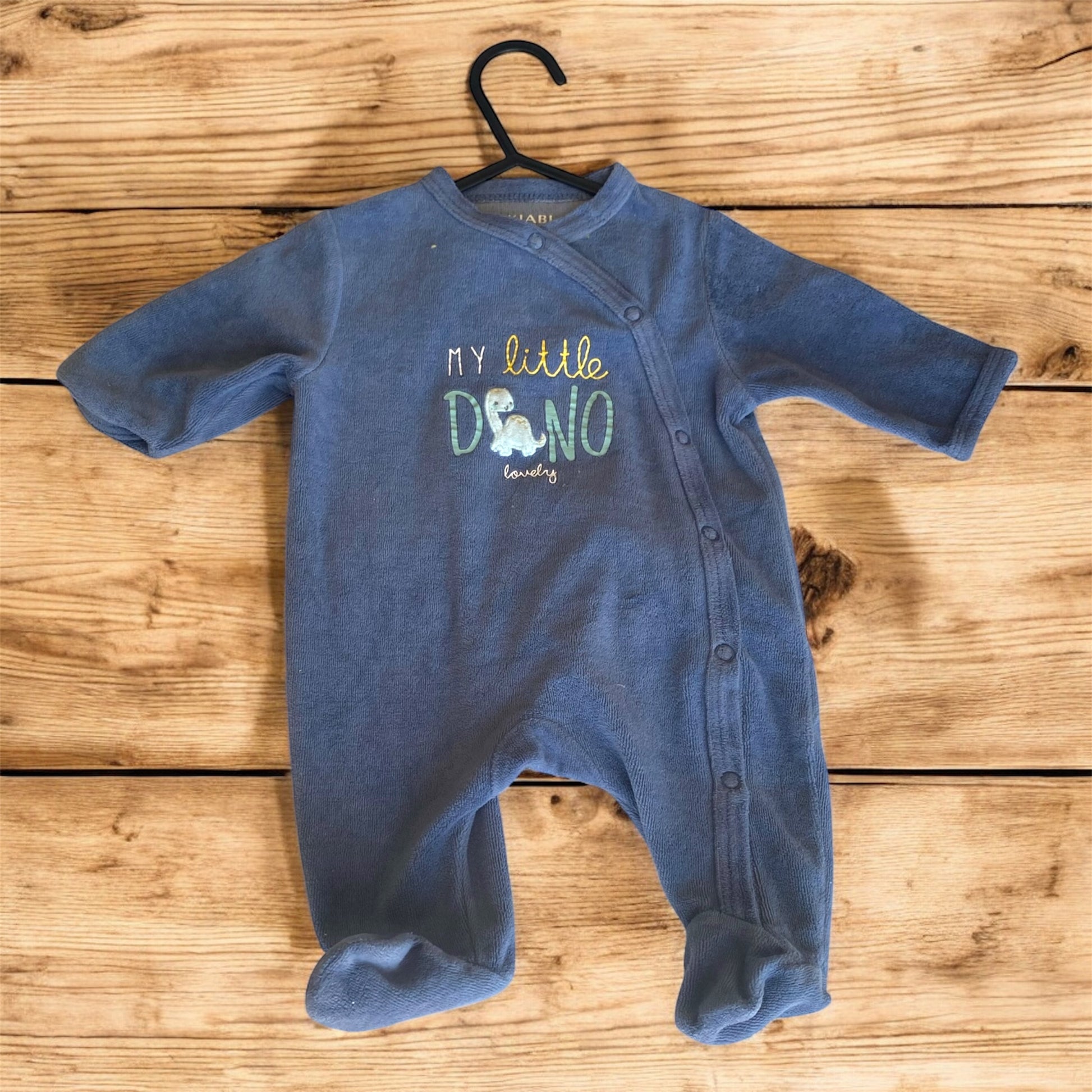 Pyjama dors-bien velours, bleu pétrole, ouverture sur le devant, motif dinosaure. 1 mois.