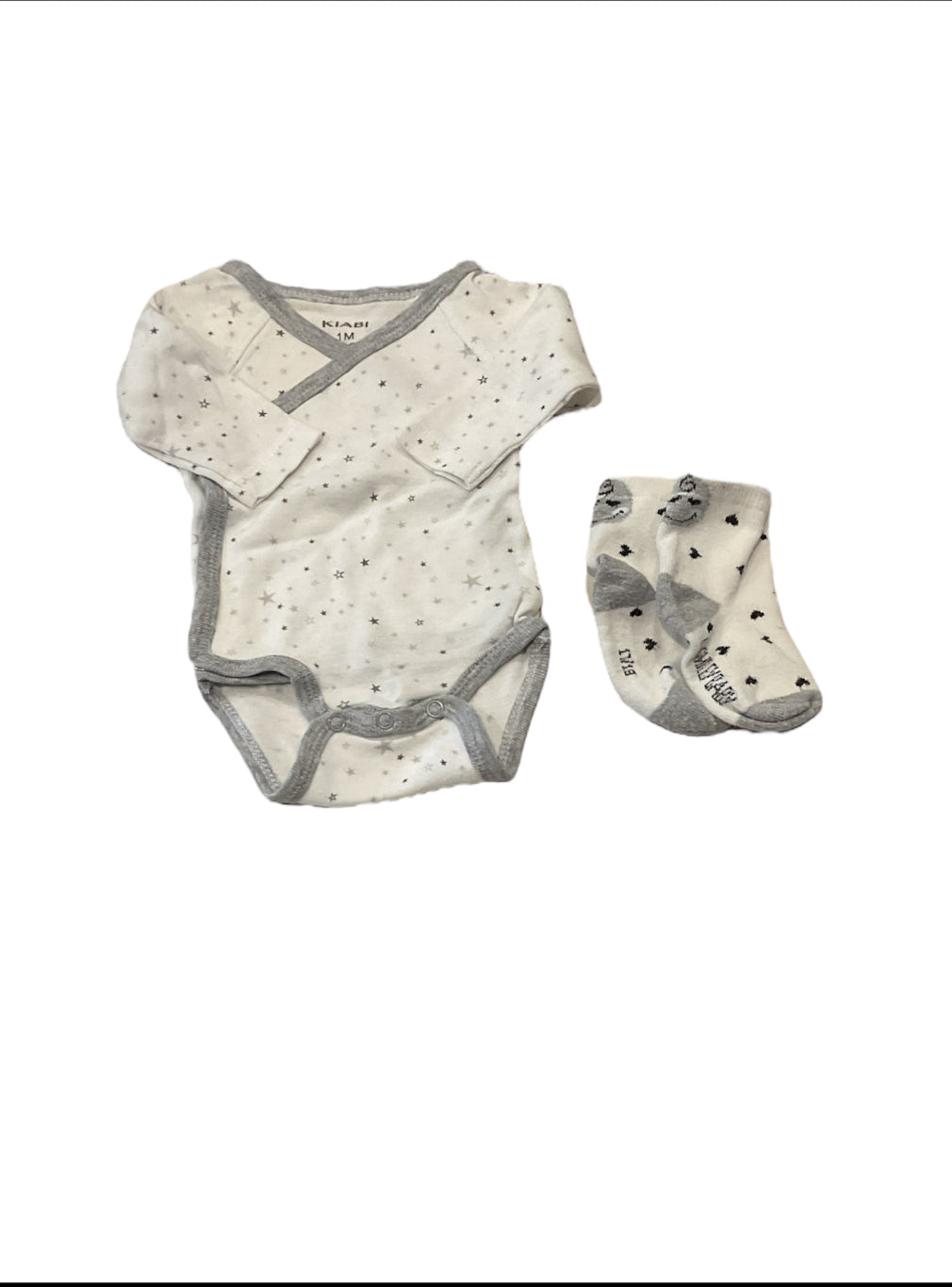 1 body croisé manches longues blanc et gris, 1 mois. 0,20€