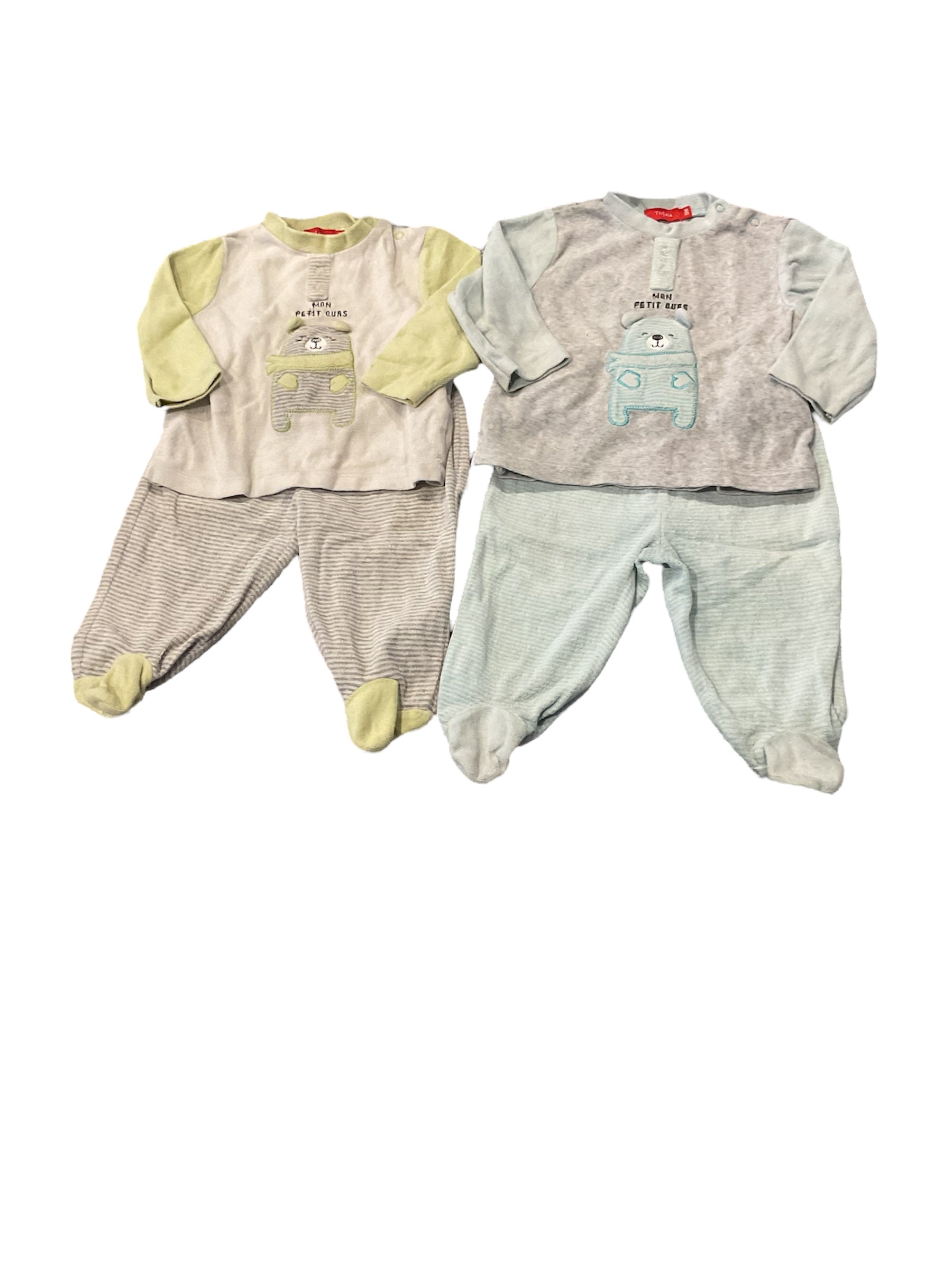 1 pyjama velours gris et vert deux pièces haut et bas, 9 mois. 1€ (0,5€+0,5€)