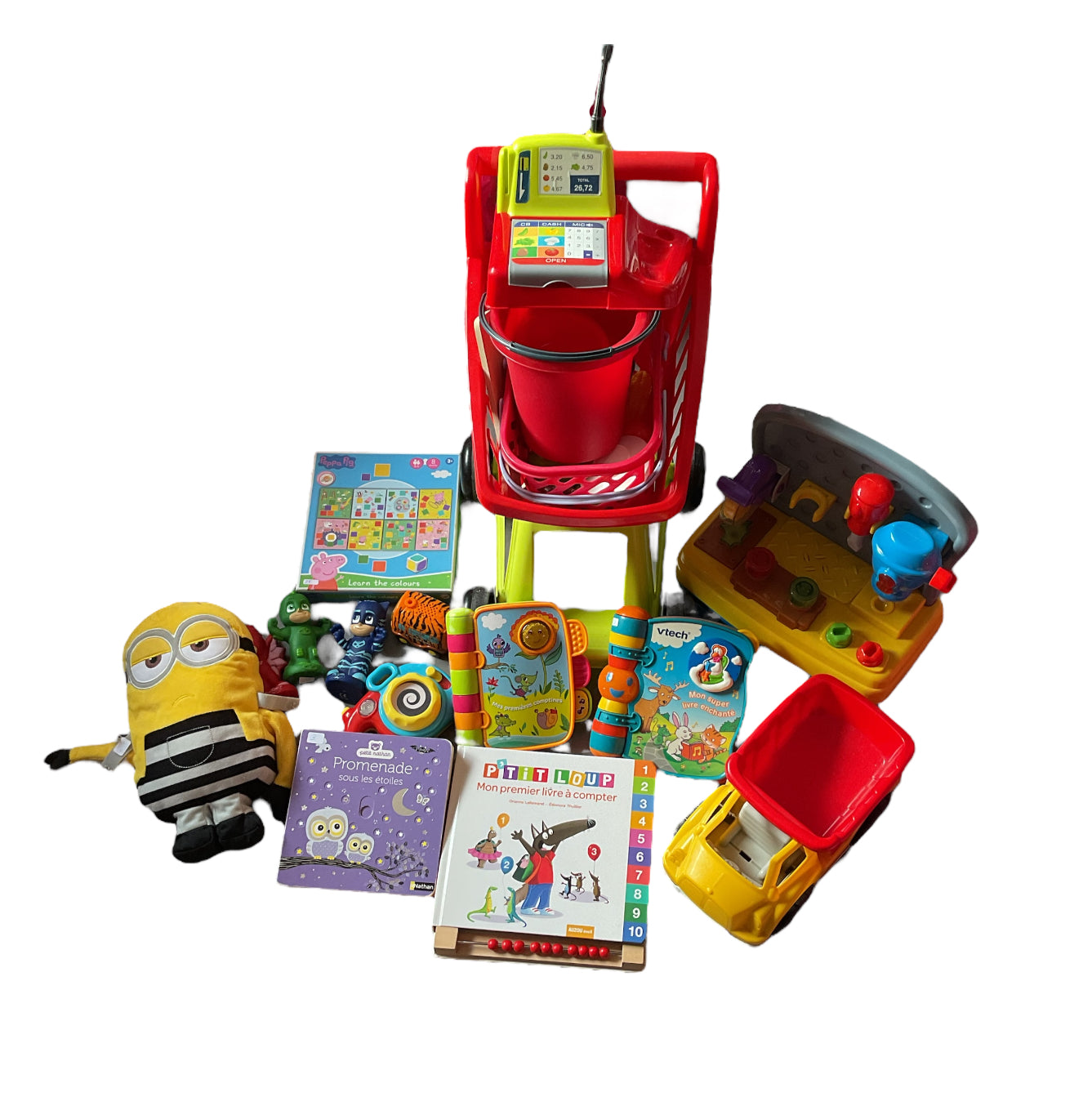 - 1 lot marchande comprenant 1 caddie, 1sceau, 1 caisse, 1 panier et des accessoires (fruits, légume, planche à découper etc…) 5€