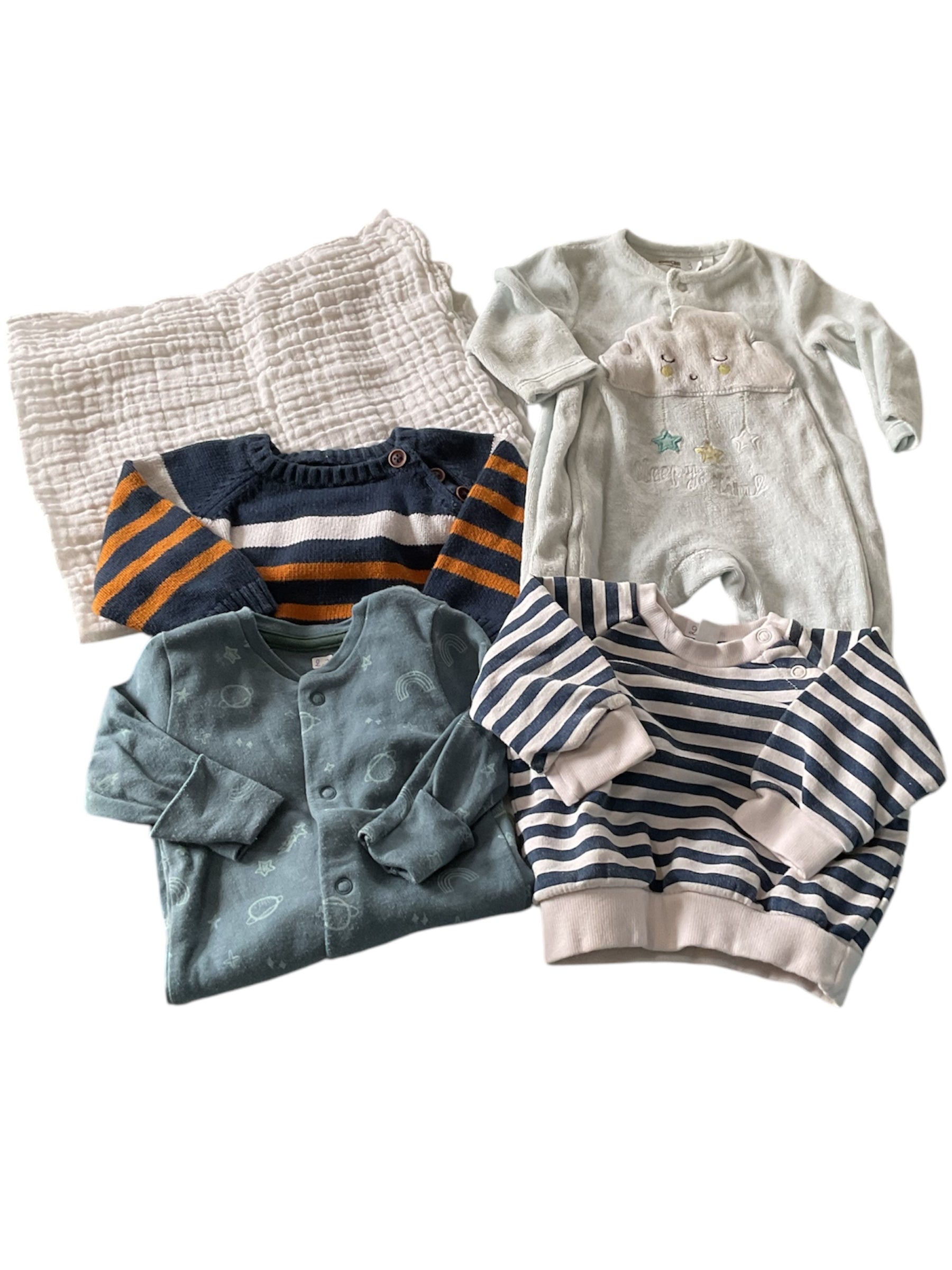 - 1 pyjama coton bleu motif espace, ouverture sur le devant, 1 mois. 2,20€