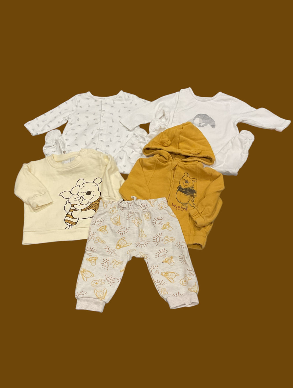 - 1 Ensemble gilet à capuche jaune moutarde motif Winnie + un pantalon beige, jaune et brun motif Winnie l’ourson et ses amis, 3/6 mois. 4,90€