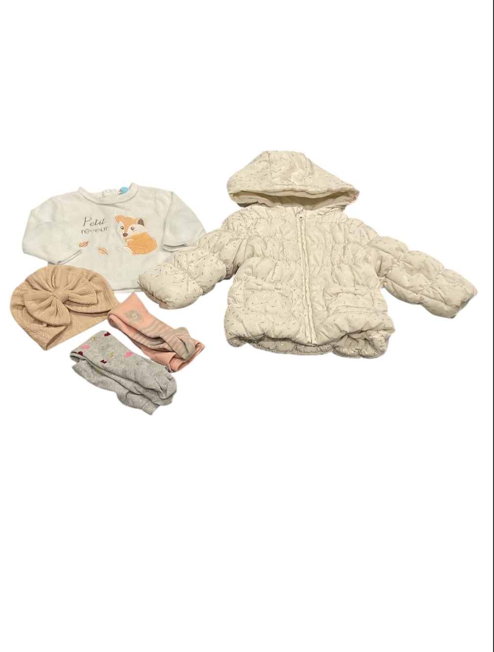 - 1 doudoune à capuche blanche, petit noeuds dorés, ( noeuds effacés sur le devant), 12 mois. 0,50€