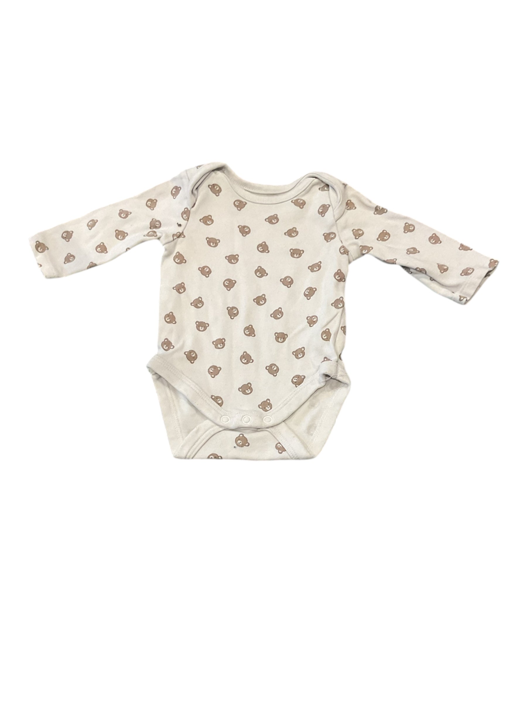 - 1 body manches longues blanc, motif oursons, ouverture par boutons pressions à l’entrejambe, 0-1 mois.