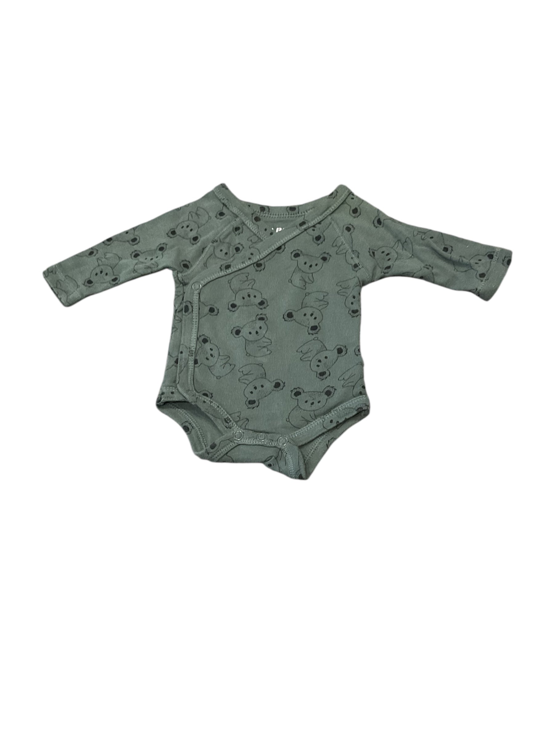 - 1 body croisé manches longues vert, motif koalas, naissance, ouverture boutons pressions sur le devant et à l’entrejambe.