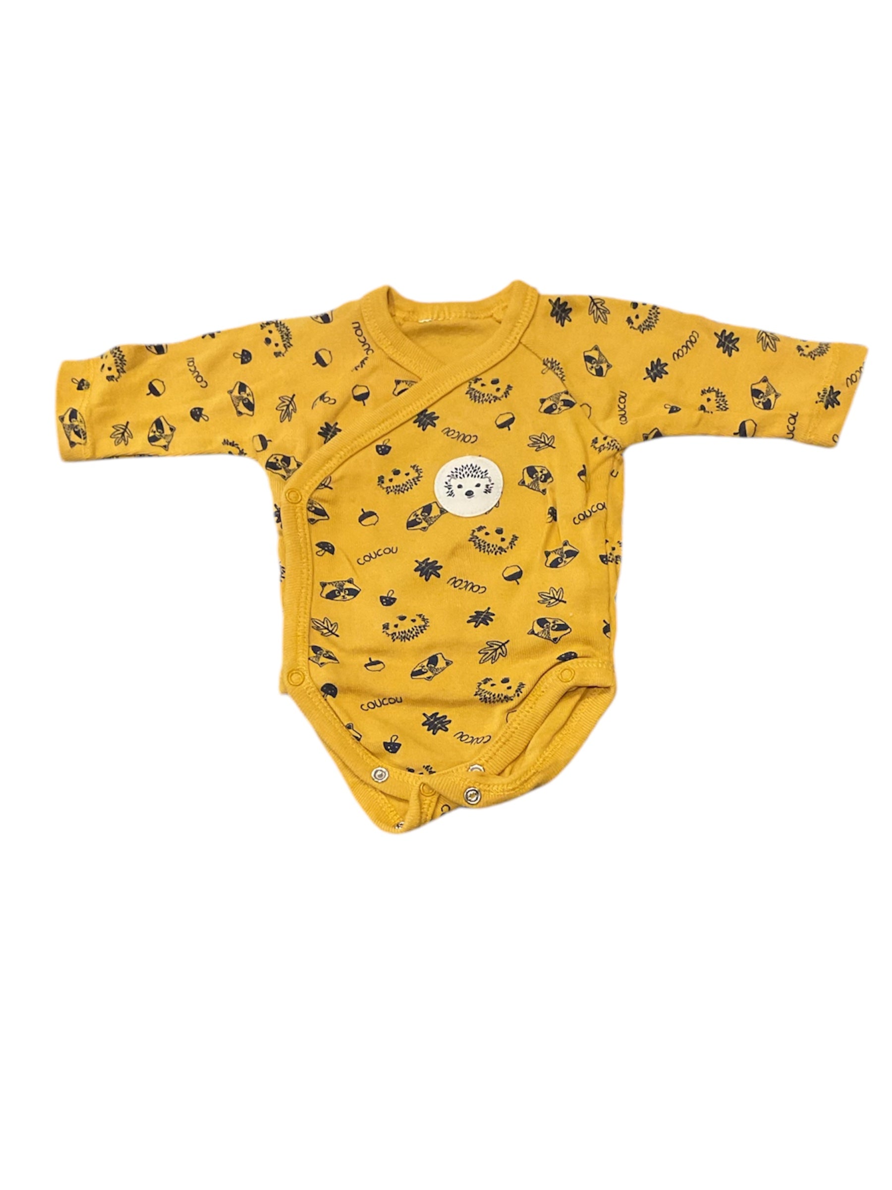 - 1 body croisé manches longues jaune, motif hérisson, naissance, ouverture boutons pressions sur le devant et à l’entrejambe.