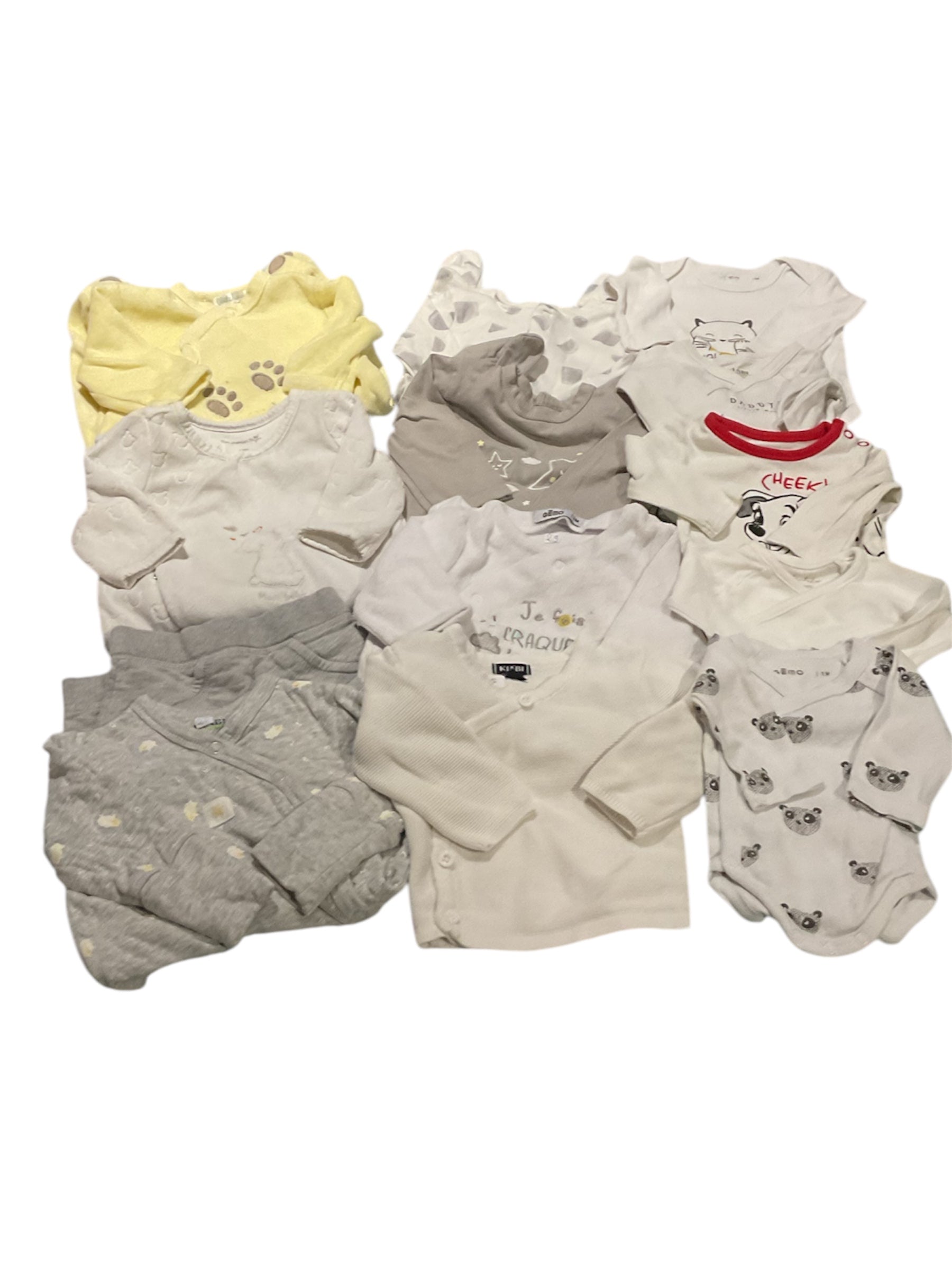 - 1 combinaison coton, grise motif petits moutons blanc, ouverture sur le devant, 1 mois. 2,50€