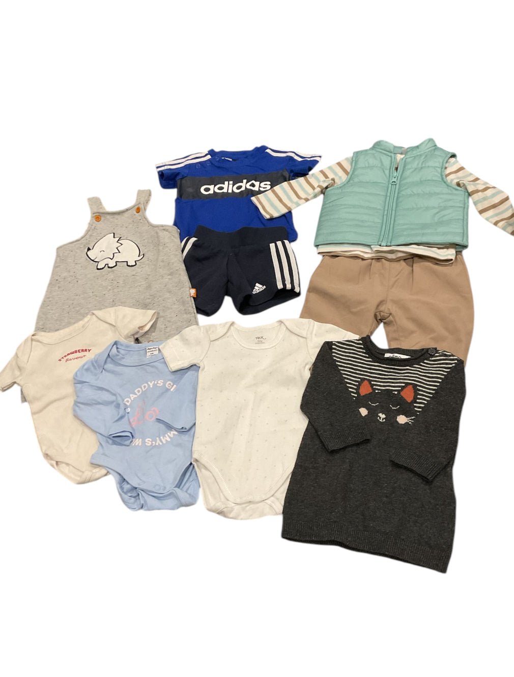 - 1 ensemble Adidas : teeshirt manches courtes bleu et marine + short bleu marine, 3 mois. 5€