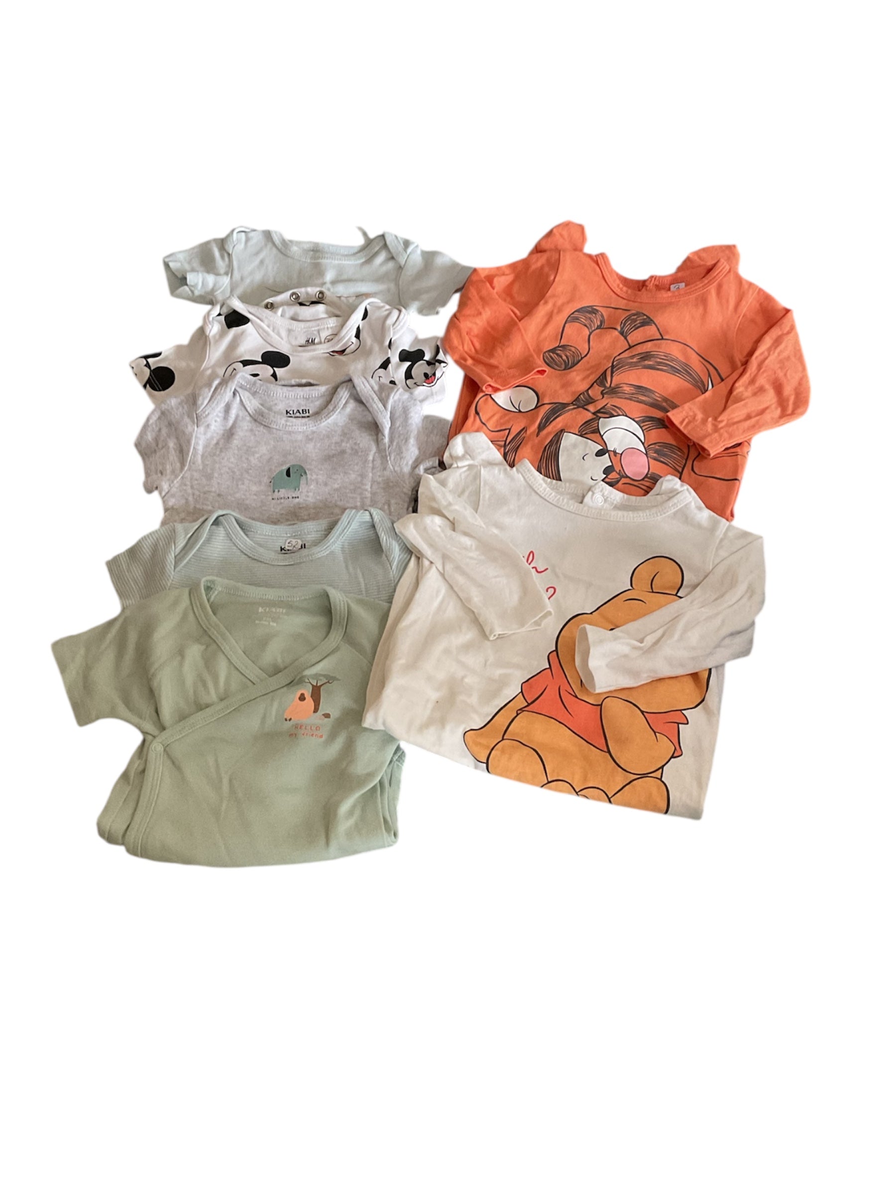 - 1 lot de 5 bodys manches courtes en taille 9 mois. 1 vert croisé, 1 bleu et blanc petites rayures, 1 gris, 1 blanc Mickey, 1 bleu clair animaux de la forêt. 5,20€