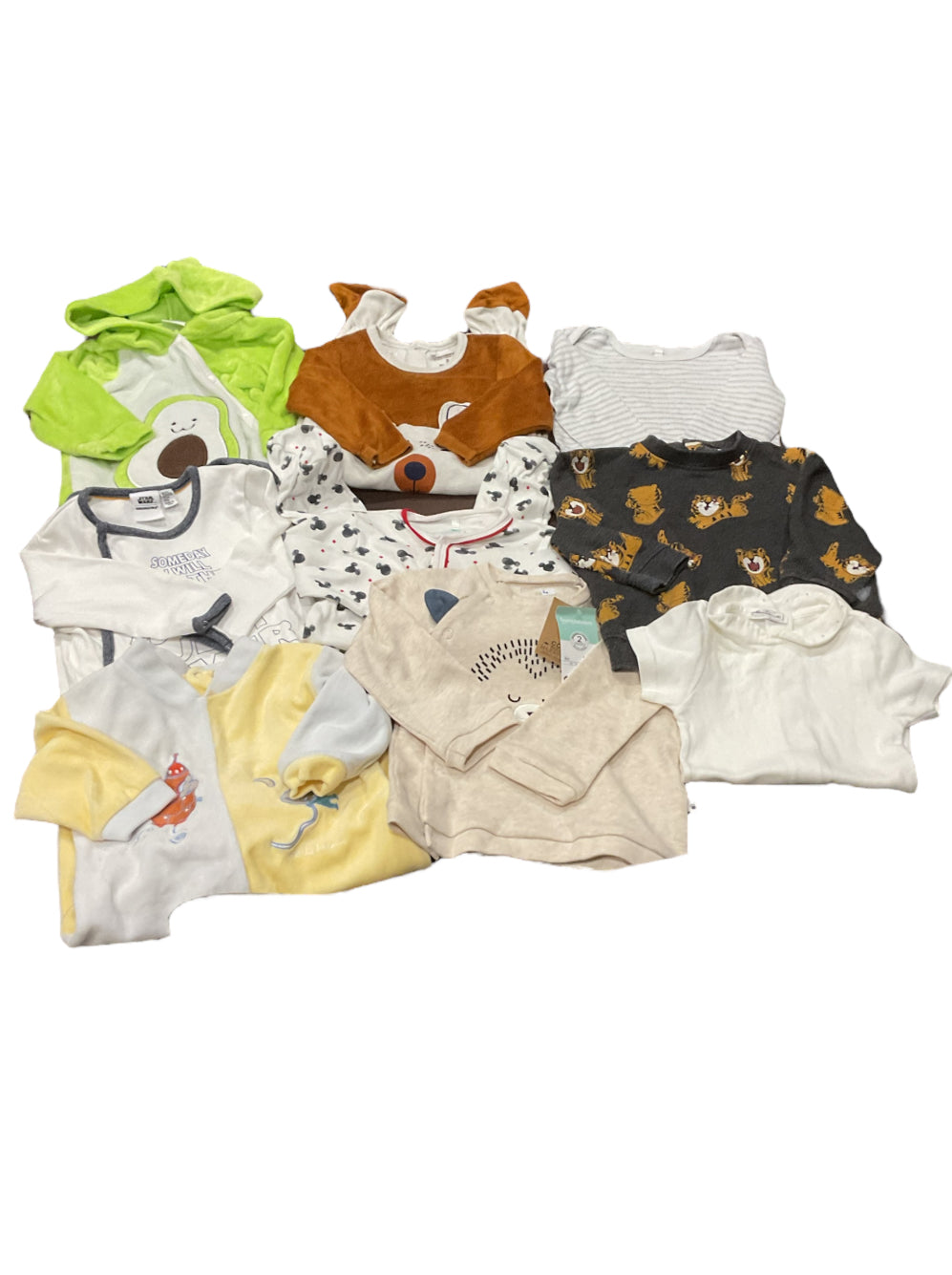 - 1 combinaison pyjama velours à capuche, blanche et verte, motif avocat, petite feuille d’avocat sur la capuche, ouverture sur le devant. 6-9 mois. 3€
