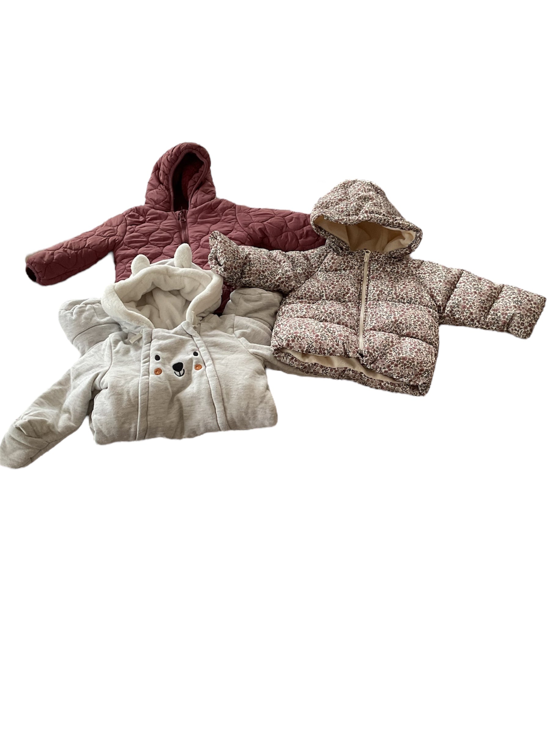 - 1 doudoune à capuche, écru motif fleuri, intérieur polaire, 6 mois. 5€