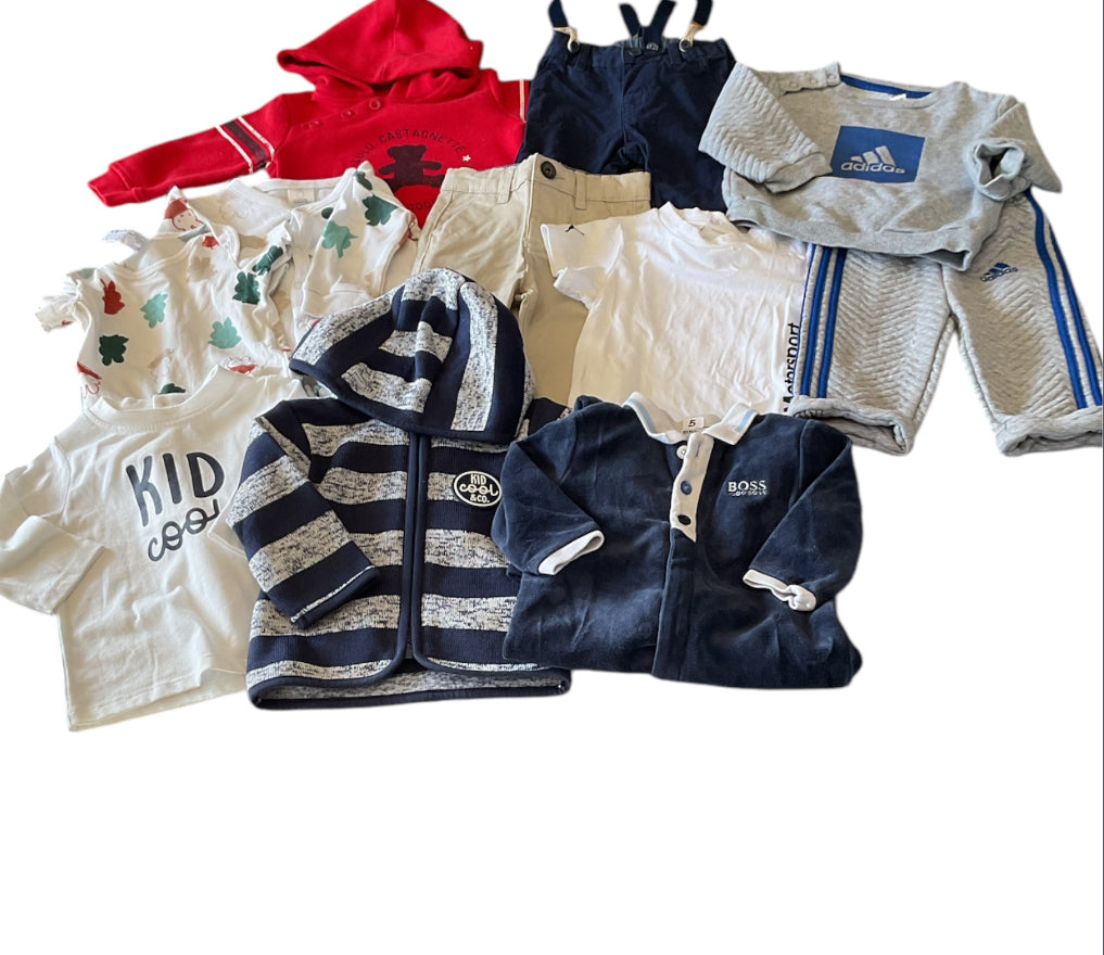 - 1 pyjama velours bleu marine et blanc, Hugo Boss, ouverture sur le devant 6 mois. 5€