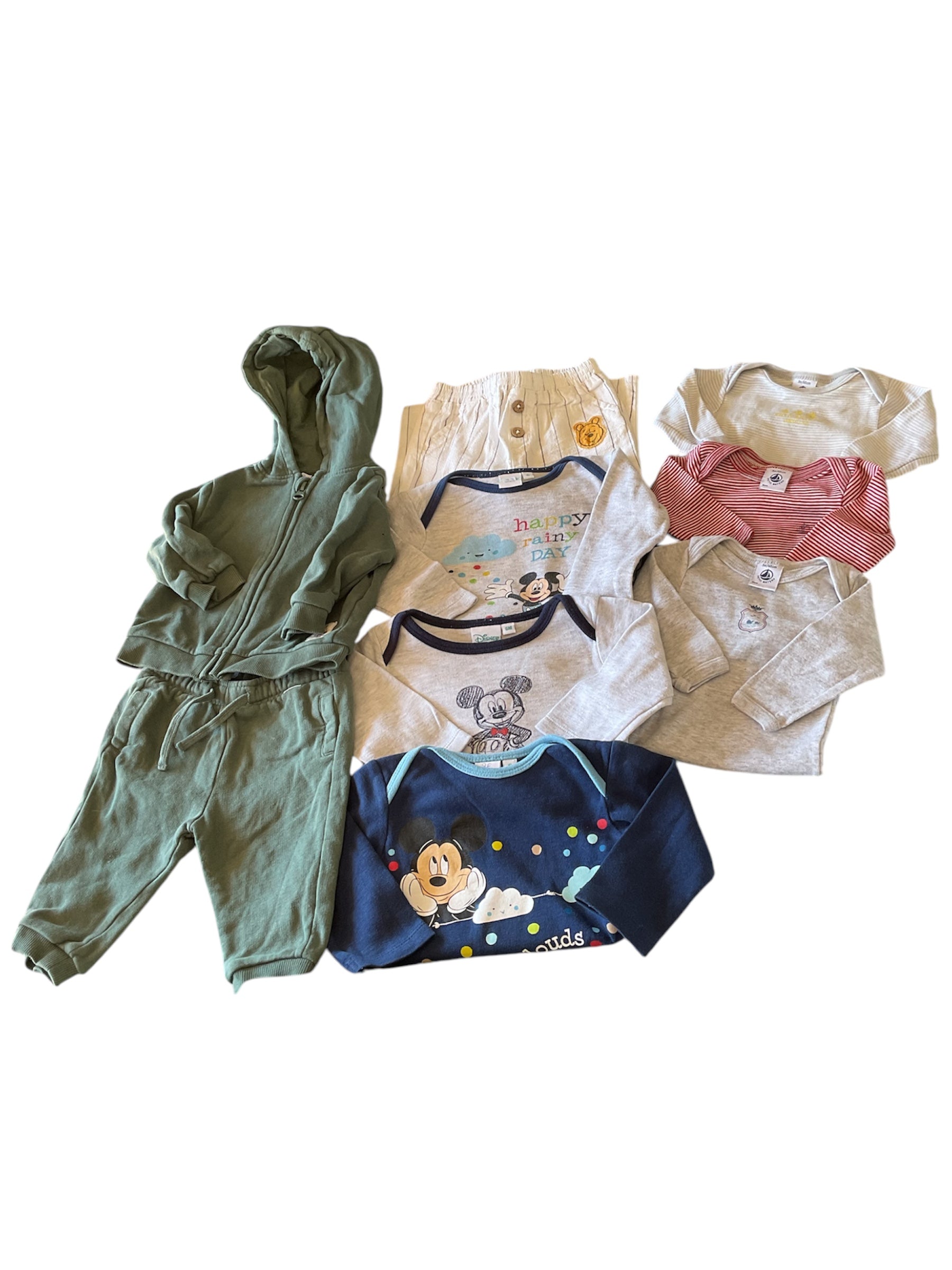 - 1 lot de 3 bodies manches longues Mickey en taille 6 mois. 1 body gris motif Mickey sous la pluie, 1 body gris motif Mickey, 1 body bleu motif Mickey et nuages. 3,20€