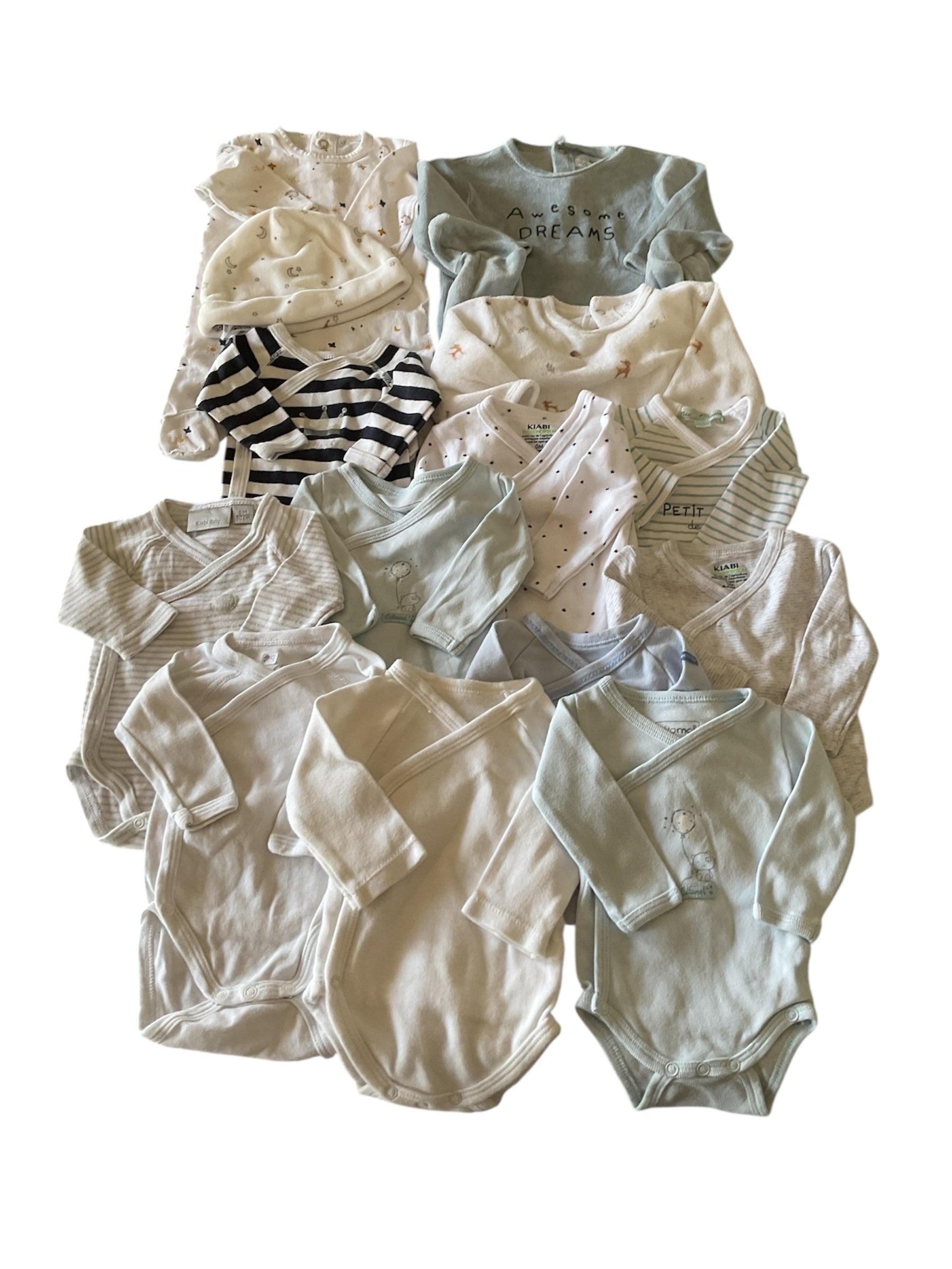 - 1 lot de 10 bodys manches longues, naissance : 2 croisé bleu clair motif petit chat, 1 croisé blanc petit bateau, 1 croisé blanc, 1 croisé bleu ciel, 1 croisé gris clair, 1 croisé rayé gris et blanc, 1 croisé rayé bleu et blanc, 1 croisé blanc étoiles, 1 croisé bleu marine et blanc Petit Bateau. 5€