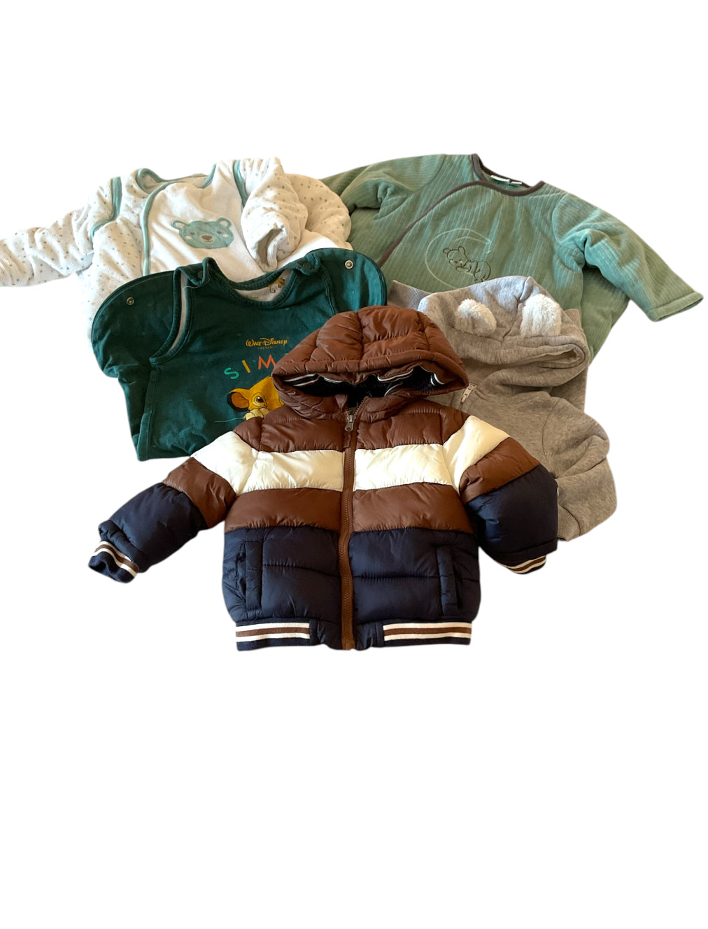 - 1 Gigoteuse fine, verte foncée, motif Simba, 0-6 mois. 3€