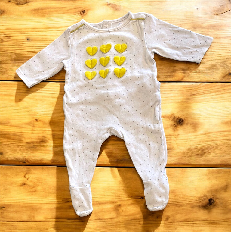 Obaïbi. Pyjama dors bien, coton, blanc à points gris, petits cœurs jaune cousus. 3 mois.