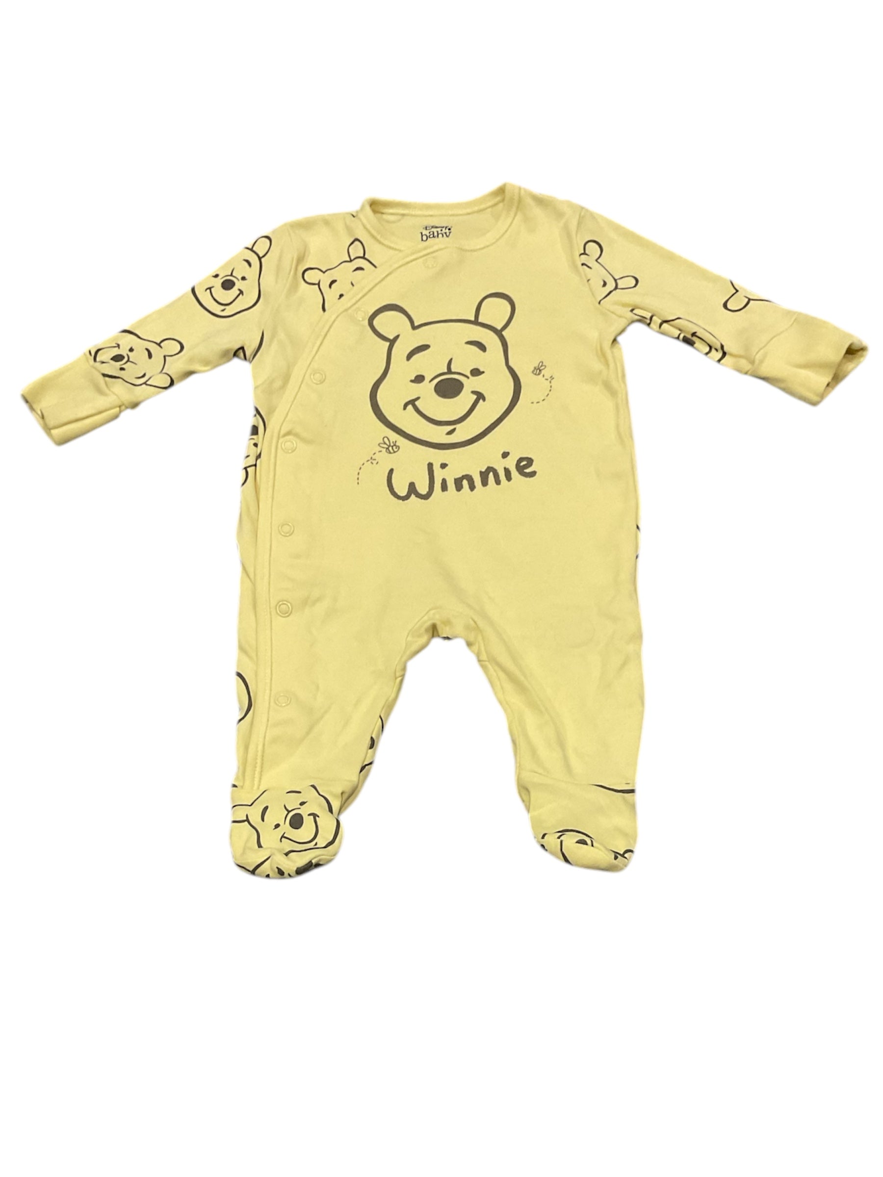 Pyjama en coton mixte en taille 3 mois. Jaune pale motif Winnie l’ourson. Ouverture boutonnée sur le devant jusqu'au pied.