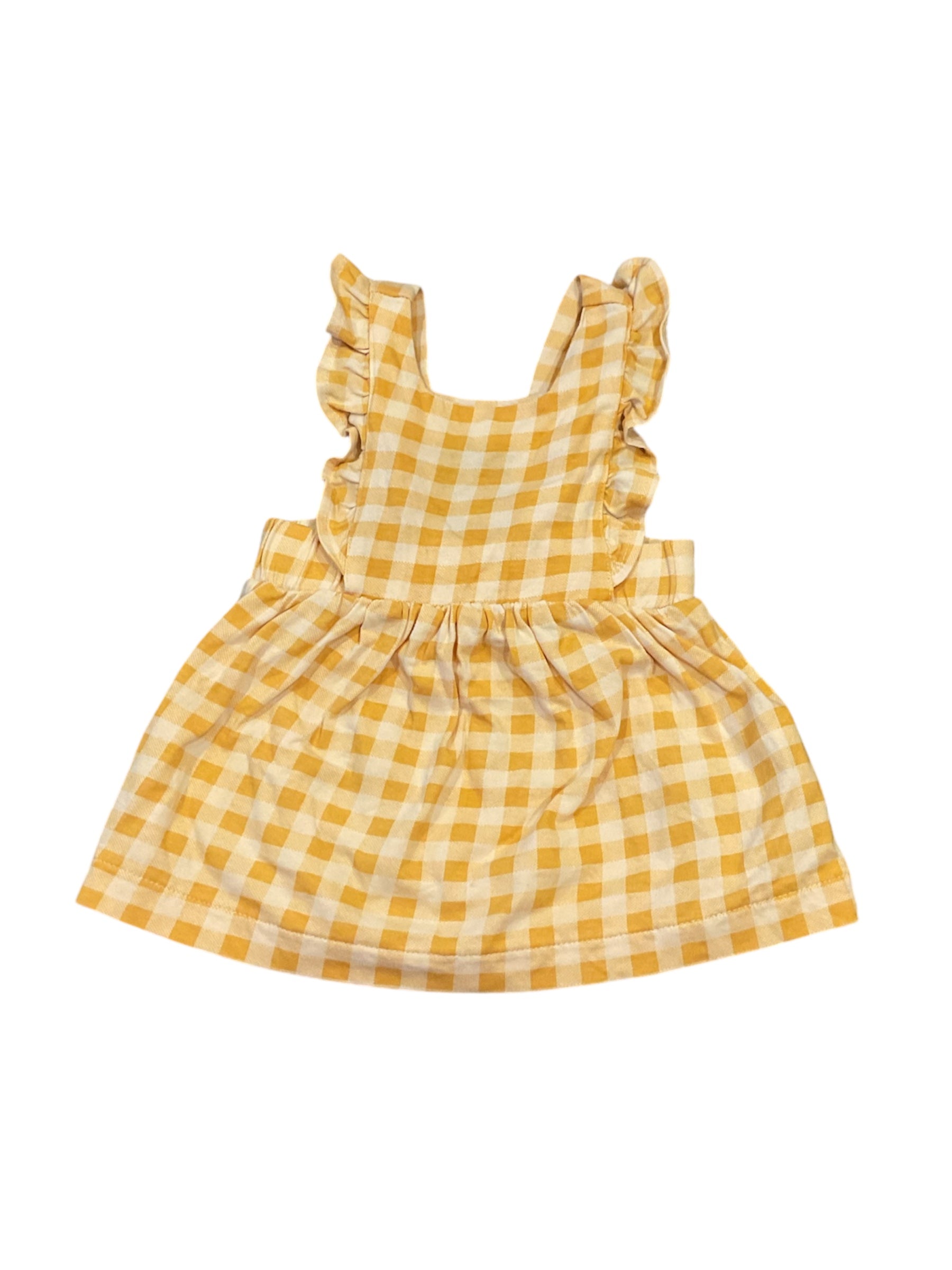 Robe en taille 3 mois, de couleurs jaunes à carreaux. Bretelles réglable par deux boutons. Petits volants assortis sur les bretelles. 100% coton.