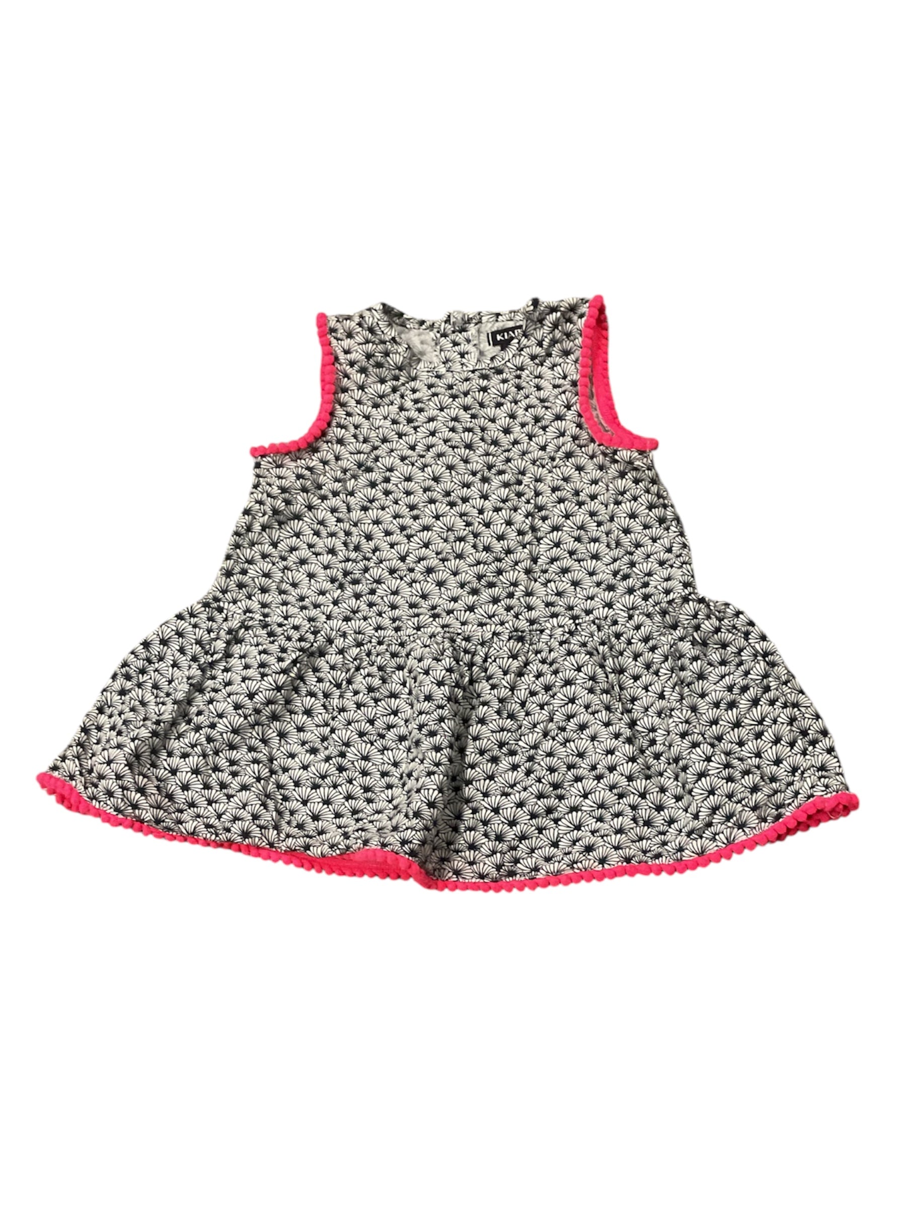 Robe sans manche en taille 9 mois. Son motif floral noir et blanc mets en valeur ses broderies rose vif le long des emmanchures et sur le bas de la robe. Ouverture par boutons au dos.