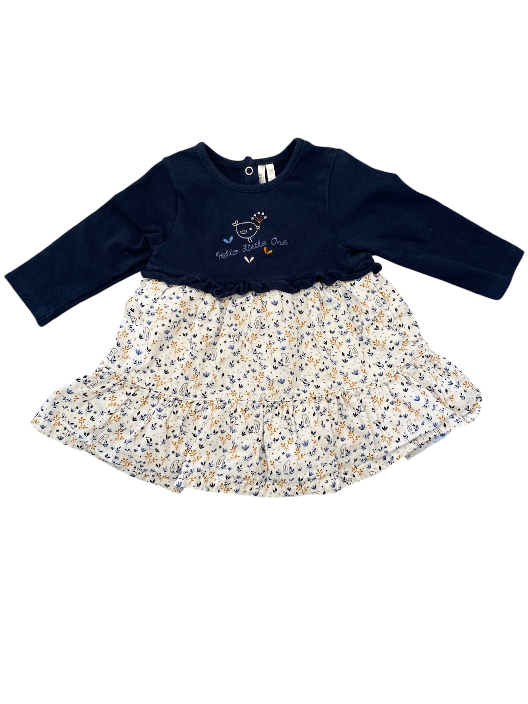 Ravissante robe manches longues de la marque Orchestra, en taille 9 mois. Le haut bleu marine est délicatement brodé d'un petit oiseau et de fleurs en blanc et jaune, ajoutant une note élégante. Le jupon blanc est orné d'un motif fleuri et de petits lapins bleu marine et jaune, pour un style adorable et joyeux. Pratique, l'ouverture par boutons-pression tout le long du dos facilite l'habillage. Confectionnée dans une matière douce et confortable, cette robe est parfaite pour allier style et praticité au quotidien.