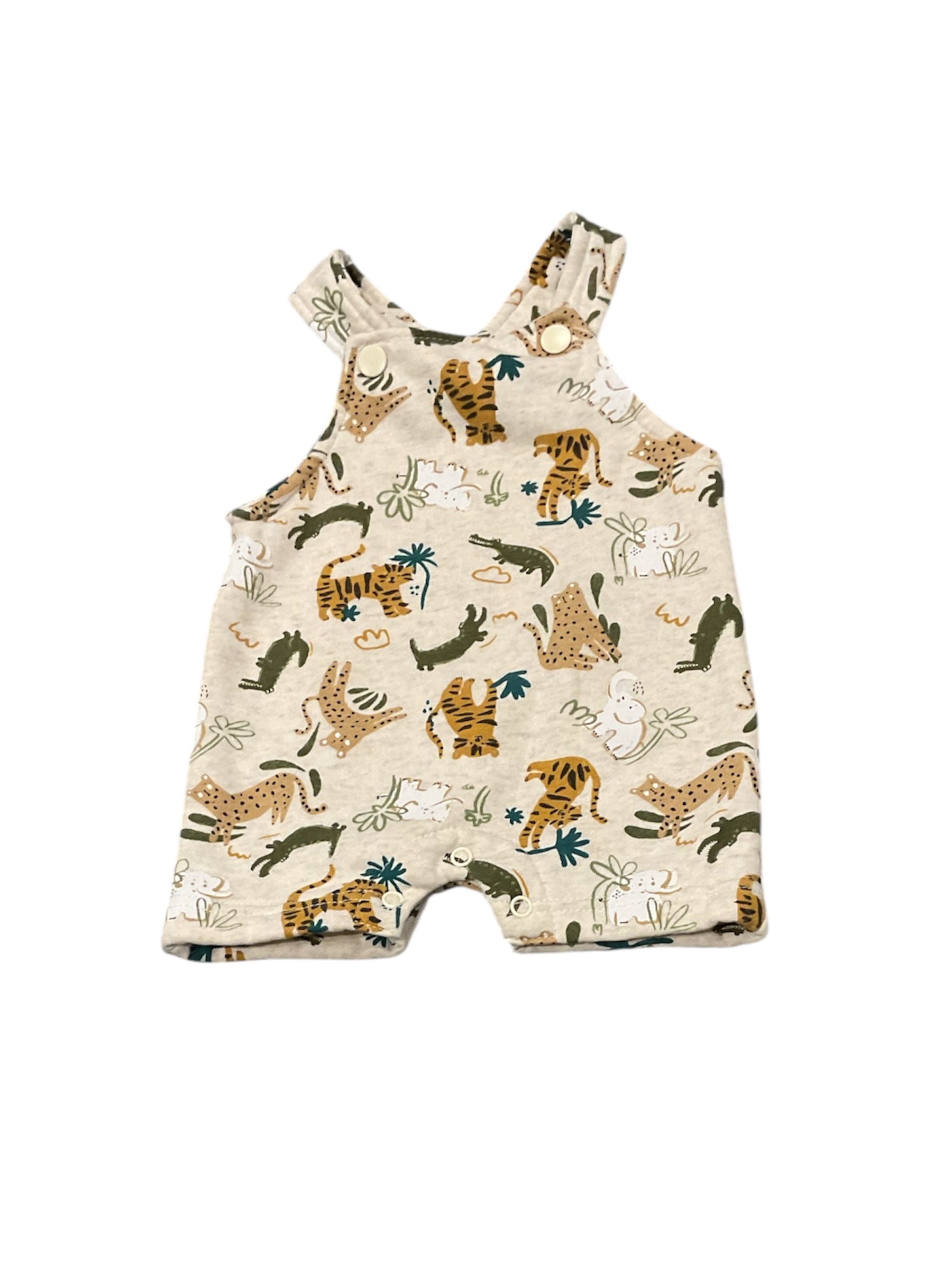 Salopette courte bébé garçon 6 mois écru motif animaux de la jungle, ouverture à l’entrejambe.