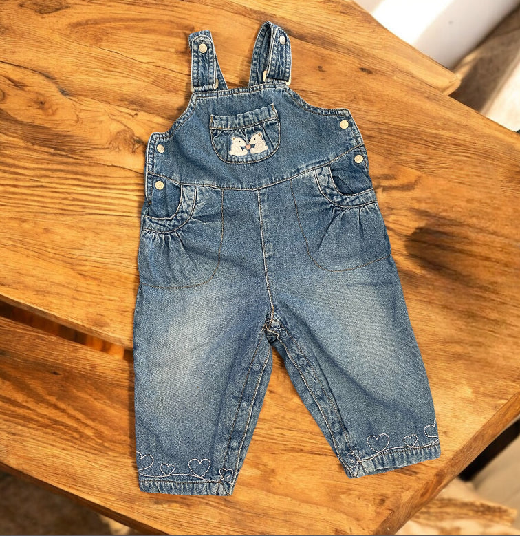 Salopette en Jean pour bébé, fille, bleu, motif oursons sur le devant.