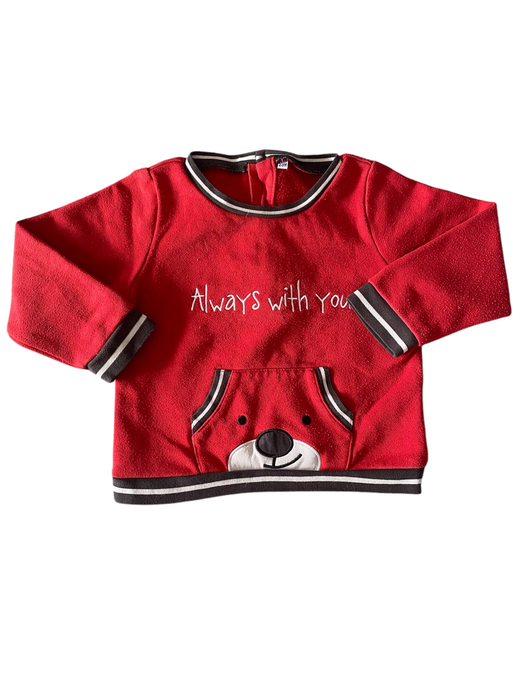 Sweat en taille 23 mois. De couleur rouge, il est orné d'un adorable motif ourson sur le devant, apportant une note tendre et joyeuse. Pratique et confortable, il dispose de deux poches chauffe-mains à l'avant, parfaites pour garder les petites mains bien au chaud. Ce sweat assure un confort optimal tout en permettant une grande liberté de mouvement. Idéal pour les journées fraîches, il allie style, fonctionnalité et confort pour accompagner toutes les aventures !