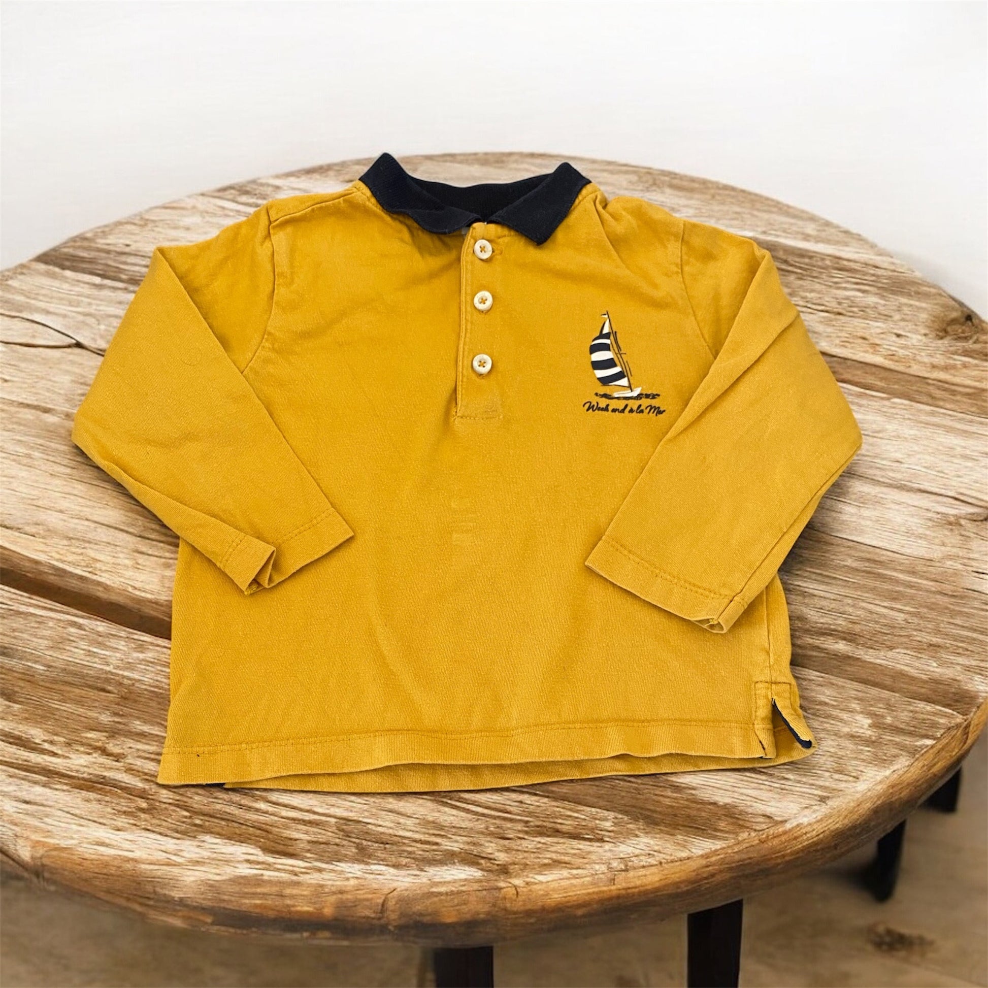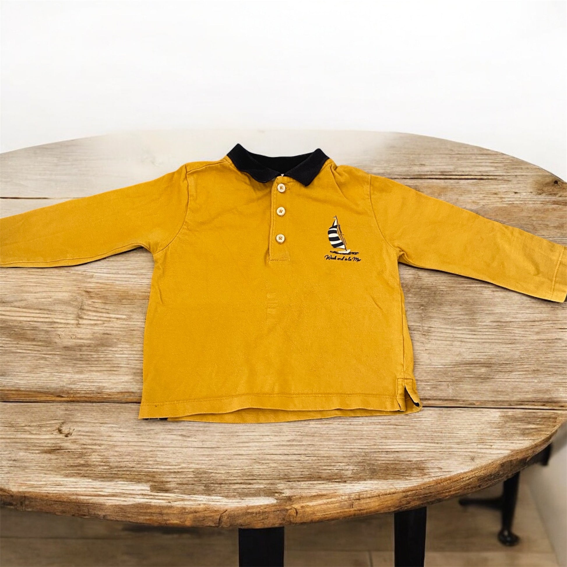 T-shirt manches longues, jaune moutarde et bleu marine, Un Week End à la Mer 24 Mois.