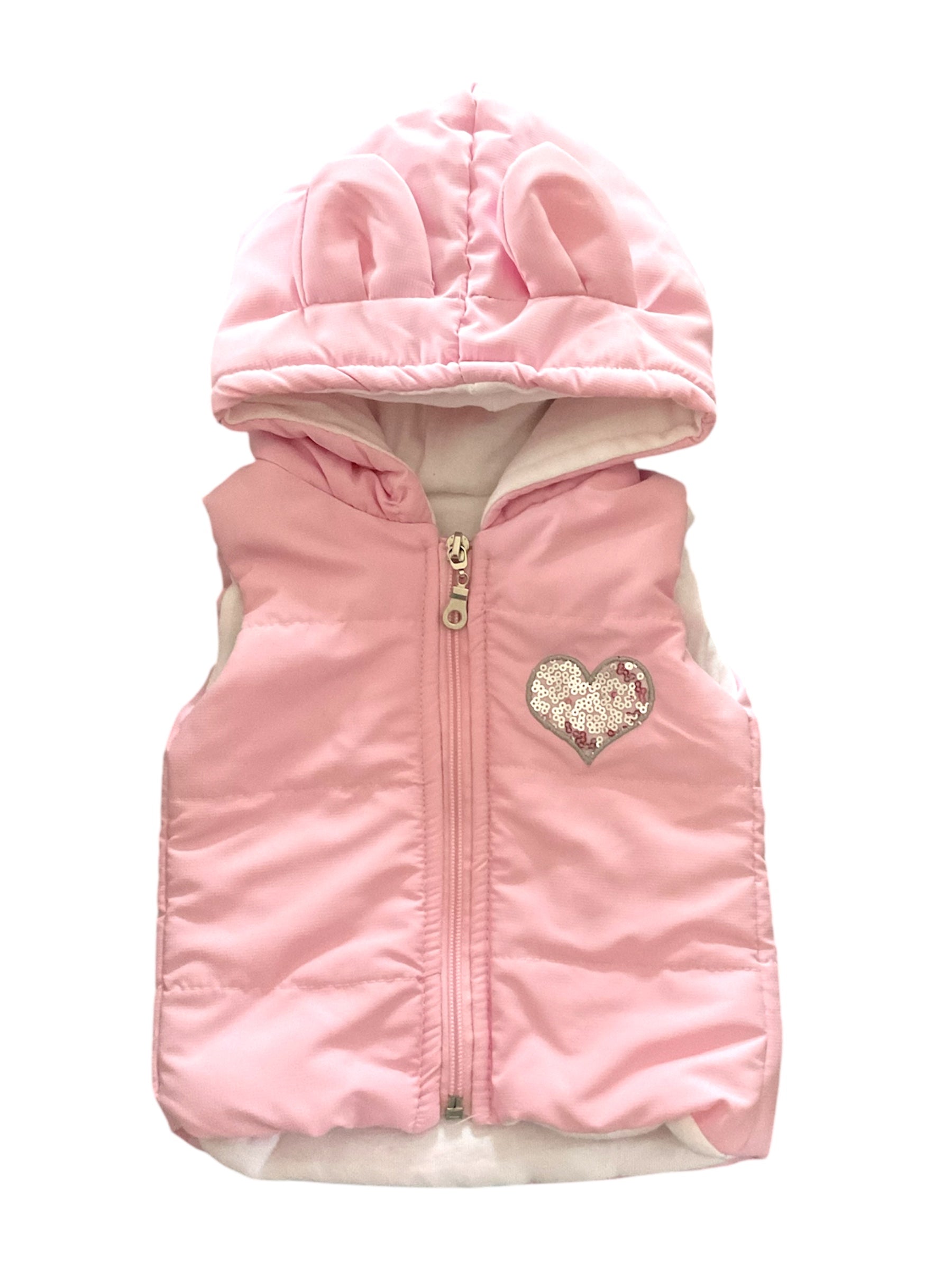 Veste sans manches à capuche, en taille 9 mois. De couleur rose, elle est ornée d’un petit cœur argenté brodé, rempli de paillettes scintillantes sur le devant, pour un effet élégant et ludique. La capuche est agrémentée de deux petites oreilles roses, apportant une note mignonne et originale. Pratique, sa fermeture éclair à l’avant facilite l’habillage. Idéale pour les journées fraîches, cette veste combine confort, style et praticité, pour envelopper votre bébé de tendresse tout en restant tendance.